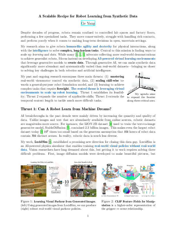 I am currently on the faculty job market (2024 - 2025 cycle). Here is my statement: A Scalable Recipe for Robot Learning from Synthetic Data